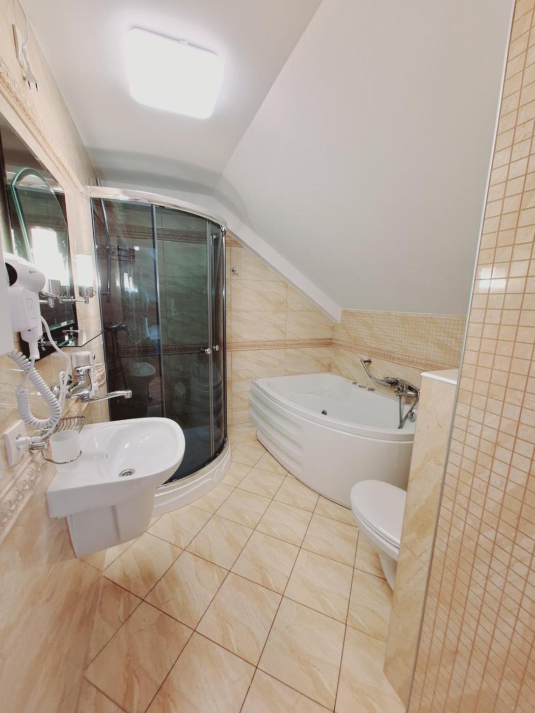 Pokój z łóżkiem typu queen-size oraz wanną z hydromasażem.. This double room features a hot tub. The double room features air conditioning, a tea and coffee maker, as well as a private bathroom boasting a bath and a shower. The double room offers a wardrobe, parquet floors, heating, a flat-screen TV, as well as ancourtyard view. The unit has 1 bed. Pokój Dwuosobowy - 2 osobowy. Powierzchnia pokoju ok.: 15 mkw. ;